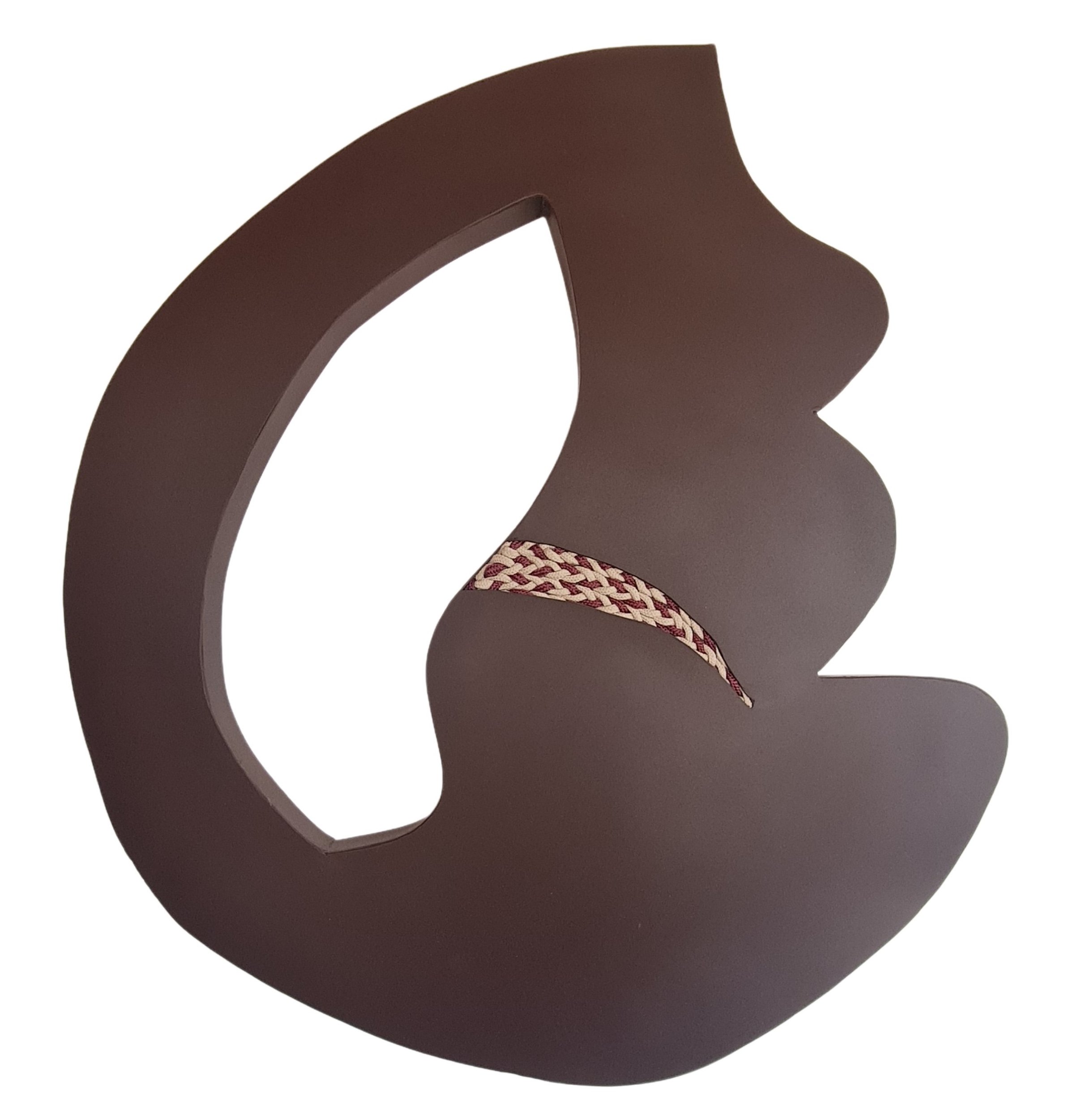 Escultura de parede em aço corten e cordas tons vinhos e areia