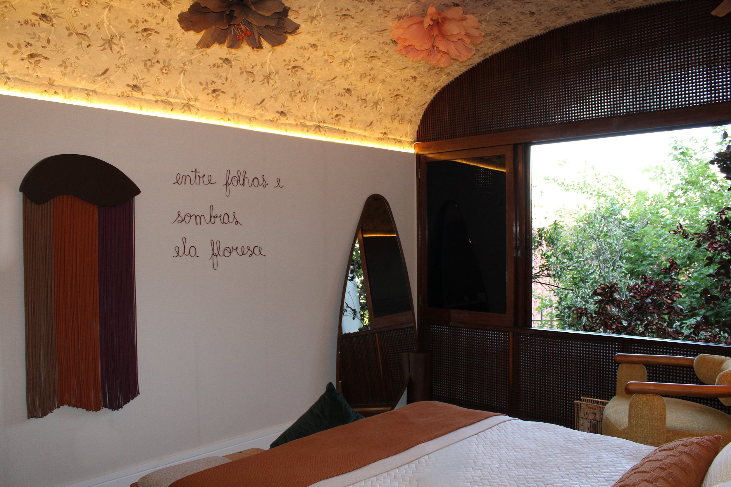 Escultura de parede em aço corten e cordas tons vinhos e terrosos