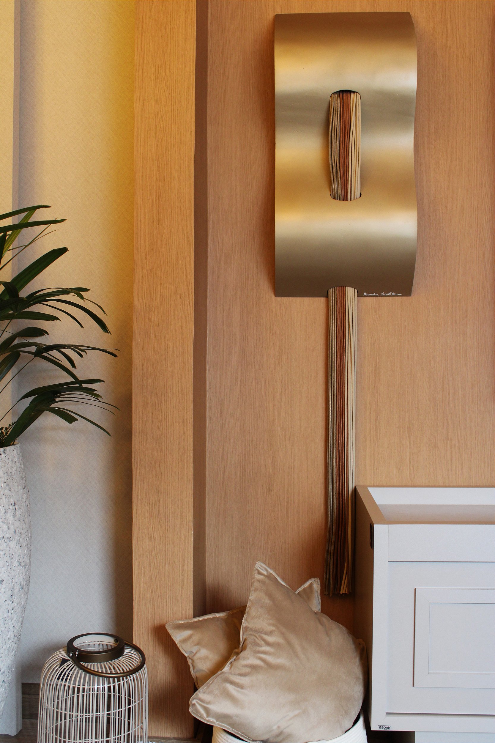 Escultura de parede em aço corten pintado em cor champagne curvado e cordas em tons claros.