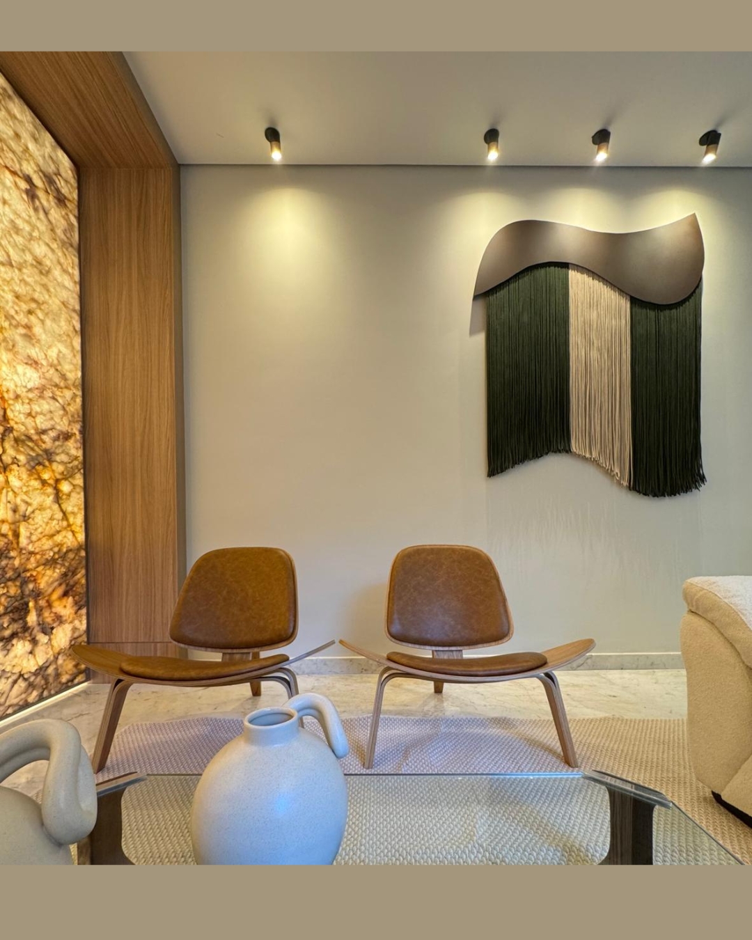 Escultura de parede em aço corten e cordas tons verde e areia.